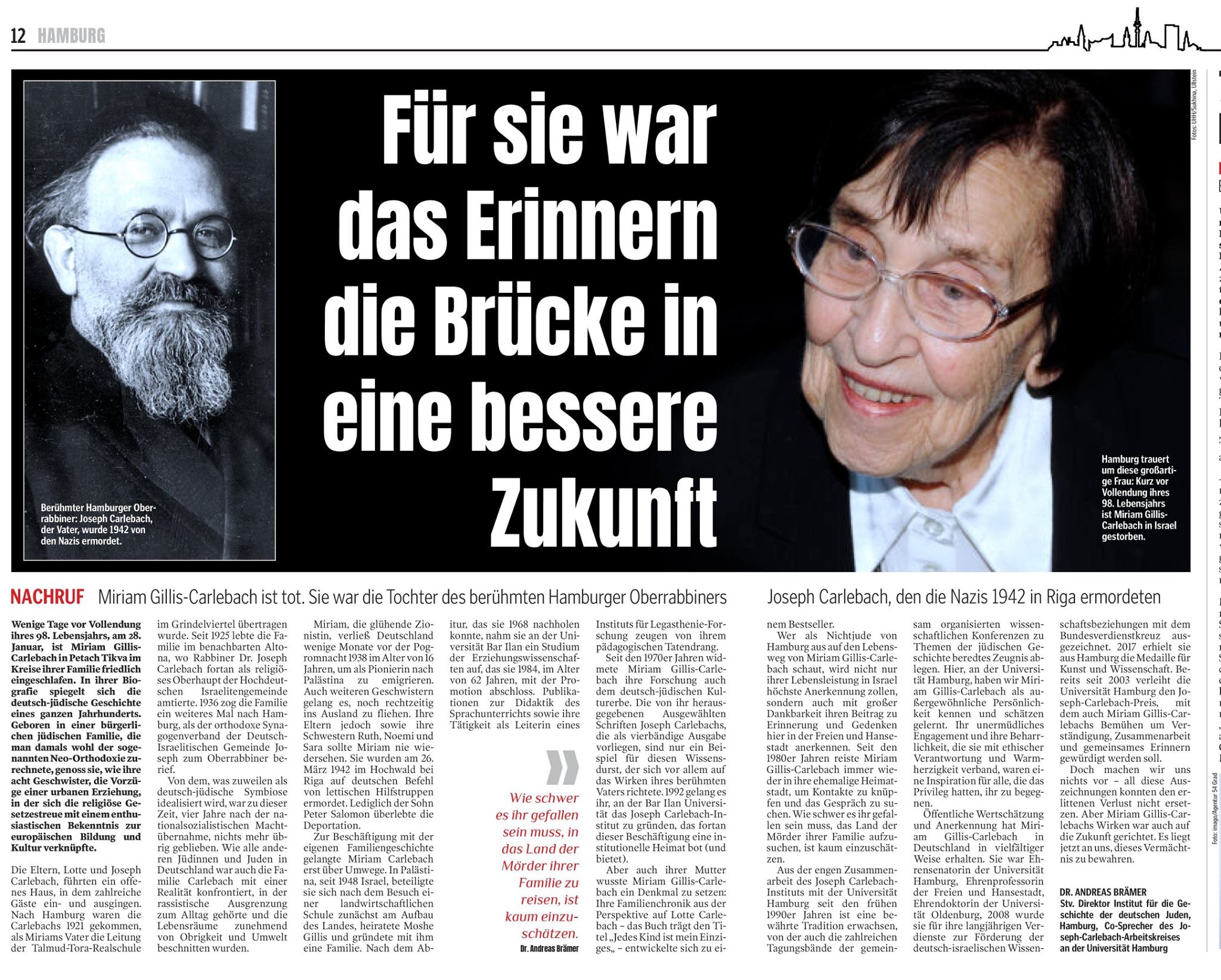 In Memory of Prof. Miriam Gillis-Carlebach (1922-2020) - Five Years Since Her Passing