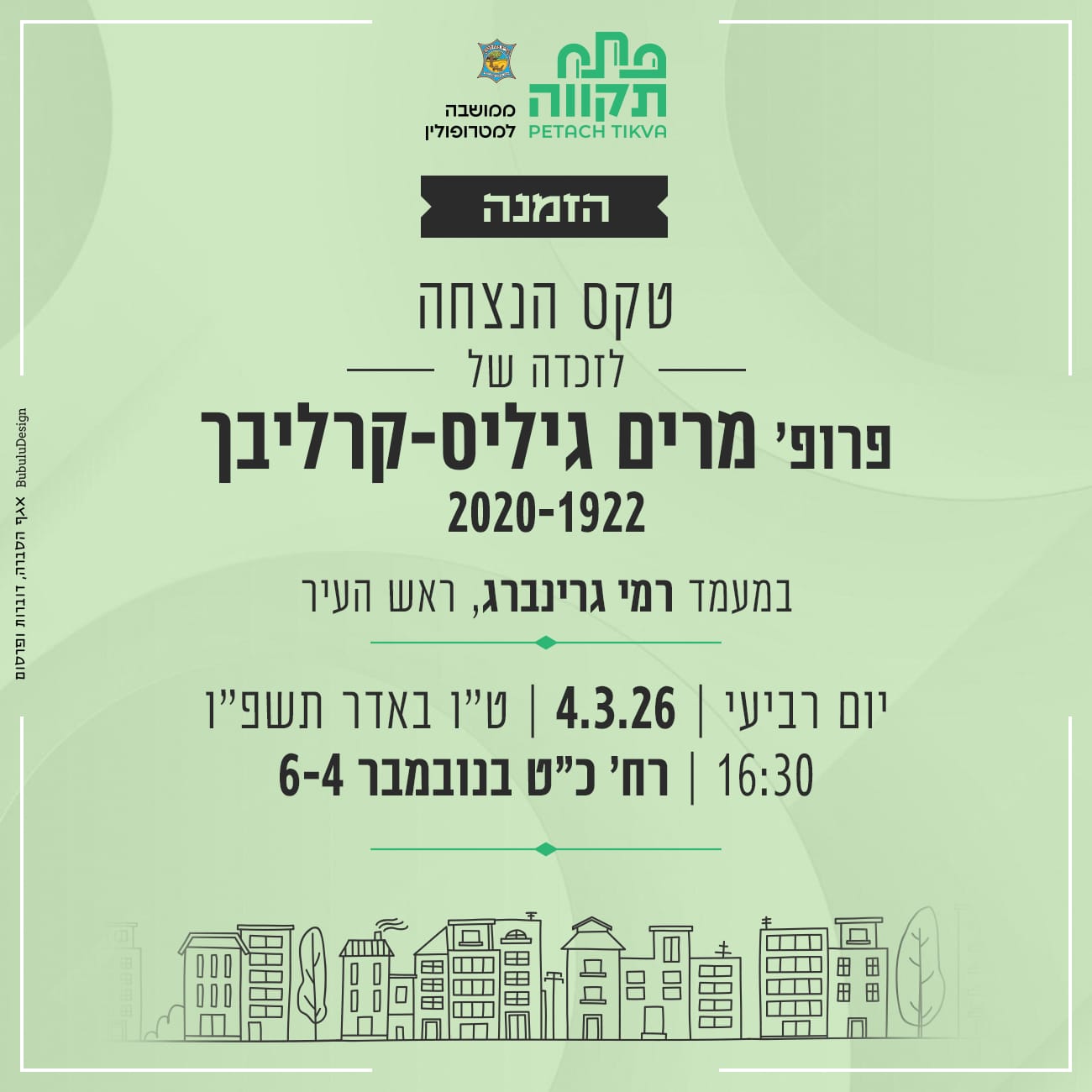 On 4 March 2026 a naming ceremony will be held in Petah Tikva for a new pathway (Mishol) dedicated to the memory of the Institute's founder, the late Prof. Dr. Miriam Gillis-Carlebach. This initiative was led by her family, with the full support of the Institute's director, Prof. Jacob Kohler, the staff, former students, and all those who cherish her memory and her profound contribution to society and historical research, both in Israel and abroad.